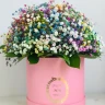 Композиция из разноцветной гипсофилы, словно радуга воплощенная в цветах, призвана принести яркость и радость в серые будни. Нежные, как облака, цветы гипсофилы создают атмосферу легкости и воздушности, напоминая о веселых днях детства. Каждый цветок, будто луч солнца, пронизывает сердце своим теплом и светом. Разноцветные оттенки гипсофилы переливаются друг в друга, создавая уникальное сочетание цветов, которое словно танец радуги на небесах. Шляпная коробка подчеркивает нежность этой композиции.